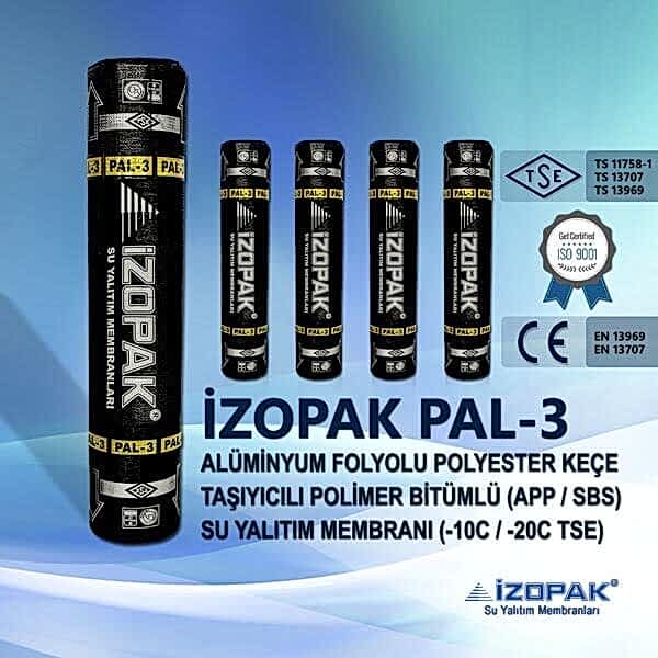 PAL-3 Keçeli ve Alüminyum folyolu bitümlü su yalıtım membranı fibrocam camtülü taşıyıcının , APP (Atactic Polypropylene) katkılı bitum asfalt bitumen ile kaplanarak imal edilir. Bir yüzü polietilen film kaplamalı olup, diğer yüzü alüminyum folyo ile kaplanarak imal edilir. PAL-3 keçeli folyolu fibrocamlı su yalıtım membranı genel olarak çatılarda baca dibi , bina ek yerleri folyolu su yalıtım izolasyonu gerektiren yalıtım noktalarında kullanır.