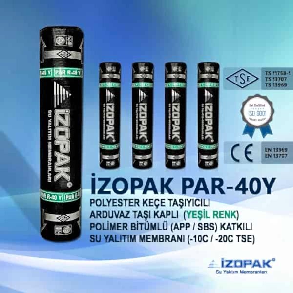 PAR-40Y Arduaz taşı kaplı polyester keçeli bitümlü su yalıtım membranı , polyester keçenin APP (Atactic Polypropylene) katkılı bitum penetrasyon asfaltın kaplanması ile elde edilir. Bir yüzü polietilen film kaplama diğer yüz arduaz mineral taş ile kaplanan polyester keçeli membran son işlem ile elde edilir. PAR-40Y arduazlı membran polyester keçeli su yalıtım membranı genel olarak çatılarda, pergule ve su yalıtım izolasyonu gerektiren yalıtım noktalarında kullanır.